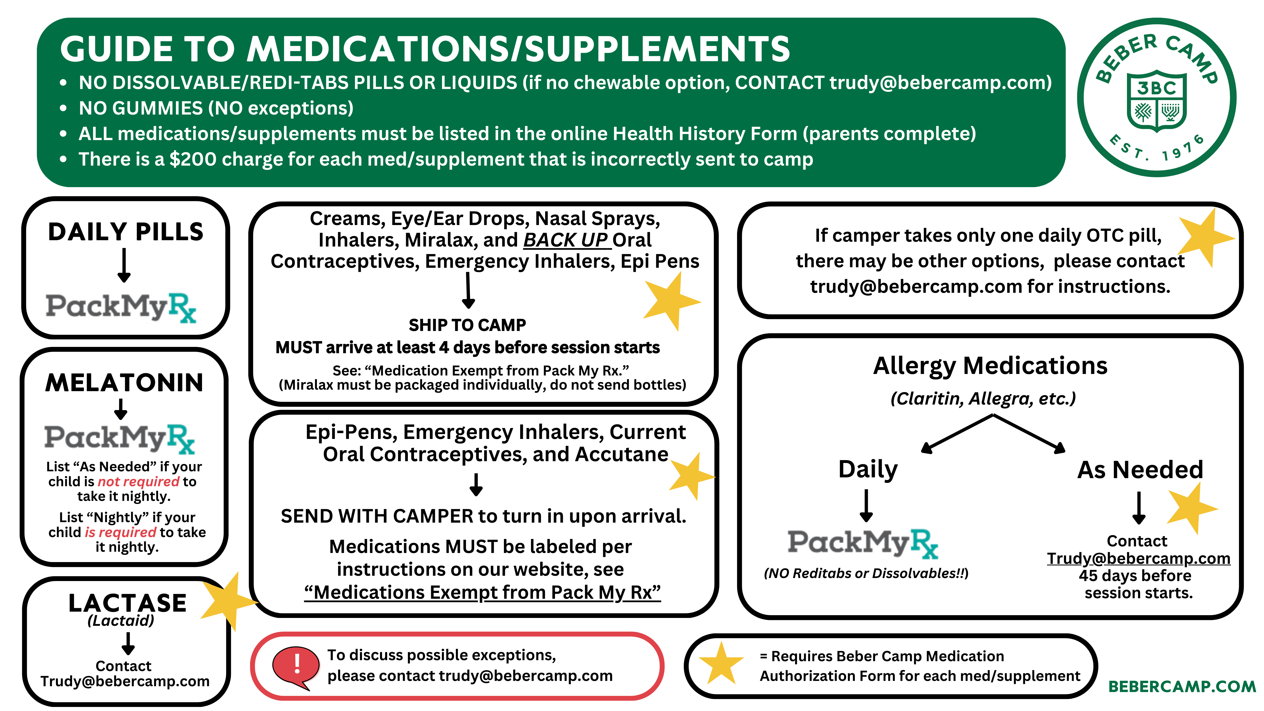 Sending medication to camp requires some advance planning. If you have any questions at any point, please reach out to trudy@bebercamp.com. We are here to help.